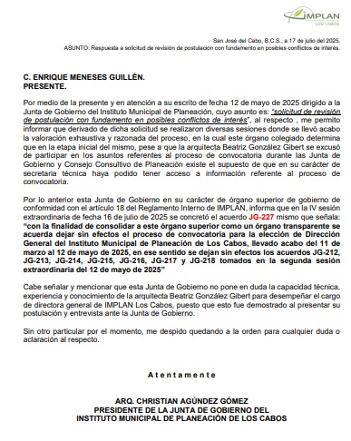 En una carta en poder de HOY BCS, donde la Junta de Gobierno notifica de la resolución al participante Enrique Meneses, quien había solicitado la revisión de postulación de González Gibert con fundamento en posibles conflictos de interés”, el presidente de la junta el alcalde Christian Agúndez Gómez, expresa: