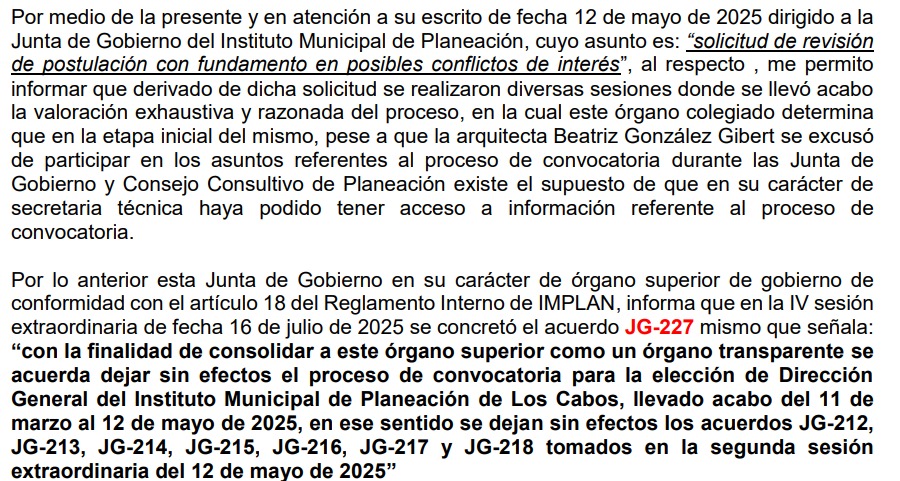 “Con la finalidad de consolidar a este órgano superior como un órgano transparente SE CUERDA DEJAR SIN EFECTOS EL PROCESO DE CONVOCATORIA PARA LA ELECCIÓN DE DIRECCIÓN GENERAL DEL INSTITUTO MUNICIPAL DE PLANEACIÓN DE LOS CABOS”.