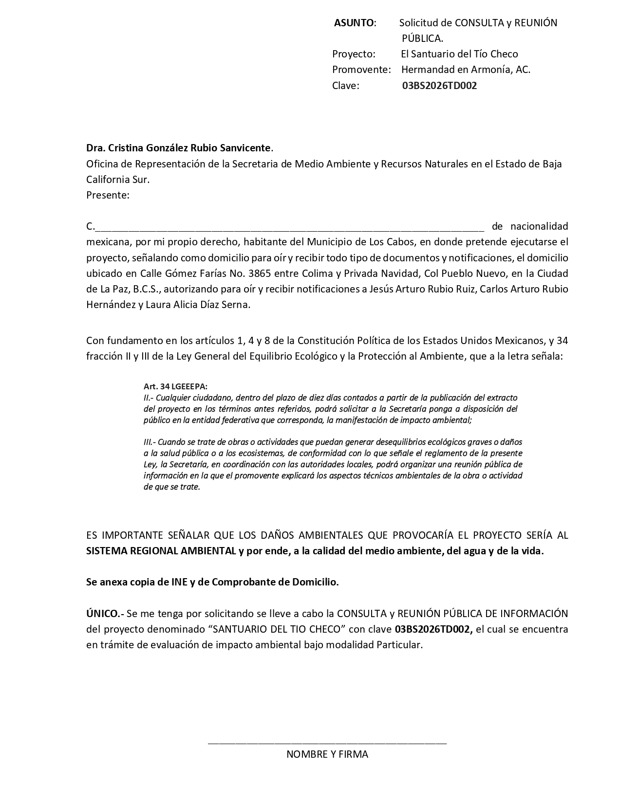 El llamado se da en el contexto de que, el 22 de enero de 2026, la asociación civil Hermandad en Armonía ingresó ante Semarnat la Manifestación de Impacto Ambiental (MIA), en modalidad particular, así como la solicitud de cambio de uso de suelo en terrenos forestales, para un desarrollo que se pretende establecer en la región de la Sierra La Laguna, municipio de Los Cabos.