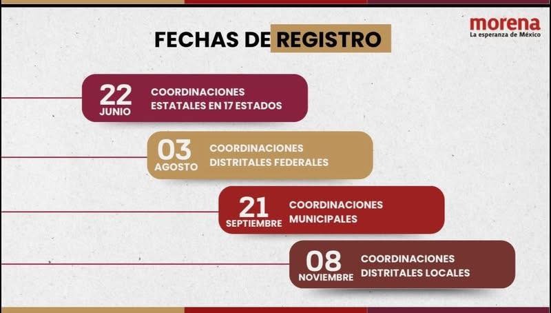 De acuerdo con las láminas informativas presentadas por Morena, el calendario del proceso interno establece que el 22 de junio se abrirán los registros para coordinaciones estatales en 17 estados del país.