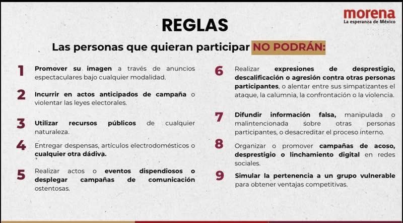 Las reglas también incluyen medidas para evitar la llamada “guerra sucia”, al prohibir expresiones de desprestigio, descalificaciones o agresiones contra otros aspirantes, así como la difusión de información falsa o manipulada para desacreditar a participantes del proceso interno.