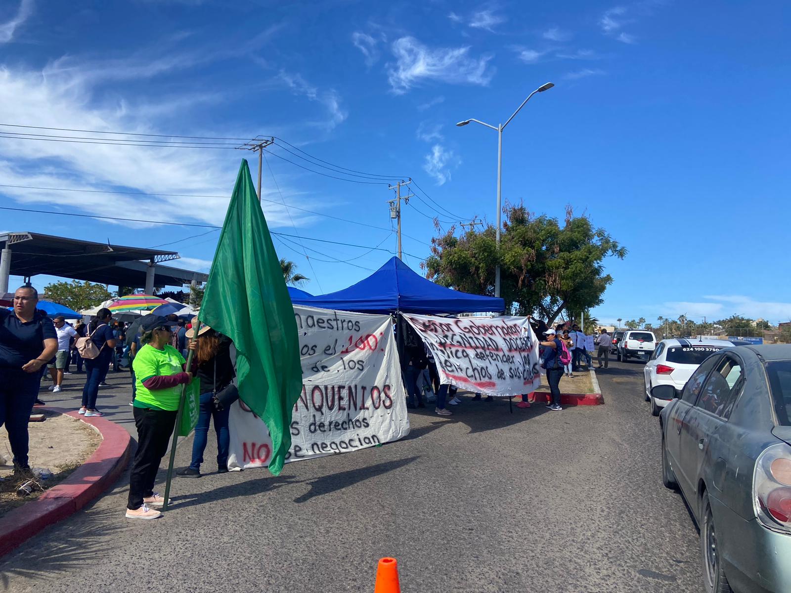 Las y los trabajadores de la educación se encuentran manifestándose en frente al auditorio municipal Leonardo Gastélum en Cabo San Lucas previo a la llegada de la candidata presidencial, Claudia Sheinbaum.