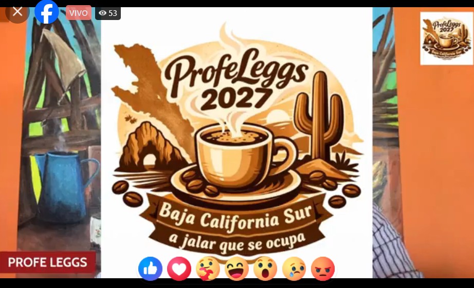 En el marco de la transmisión el ex alcalde presentó el logotipo para calcomanías de su proyecto político, donde se observa una taza de café característica en él, con la leyenda “Profe Leggs 2027 Baja California Sur, a jalar que se ocupa”.