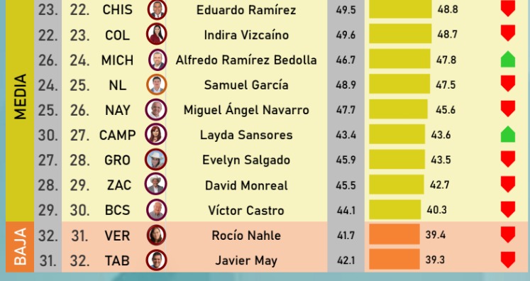 Siendo superado para mal, únicamente por la gobernadora de Veracruz, Rocío Nhale en el lugar 31 con 39.4% de aprobación y el gobernador de Tabasco, Javier May en el sitio 32 y con el 39.3 de aprobación.