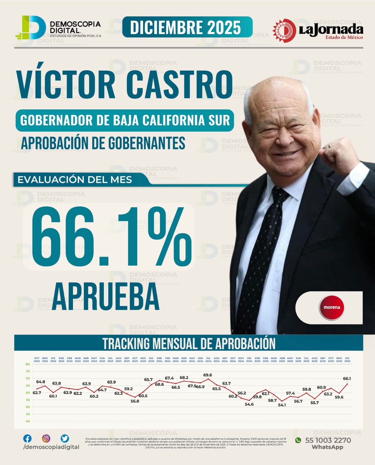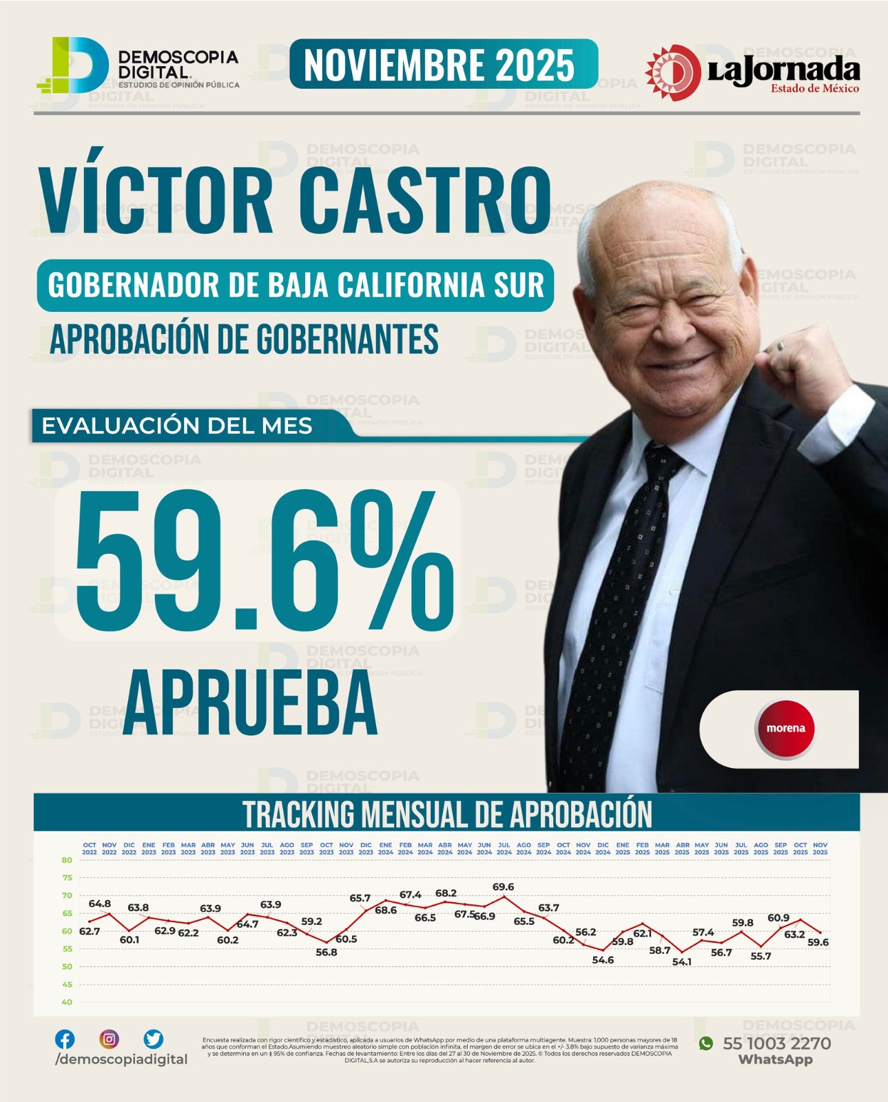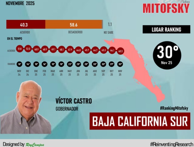 En su más reciente ejercicio de noviembre del 2025, Mitofsky señala que Víctor Castro tiene un índice de aprobación de su gobierno del 40.3%, lo que lo coloca en el lugar 30 del ranking de los 32 gobernadores del país.