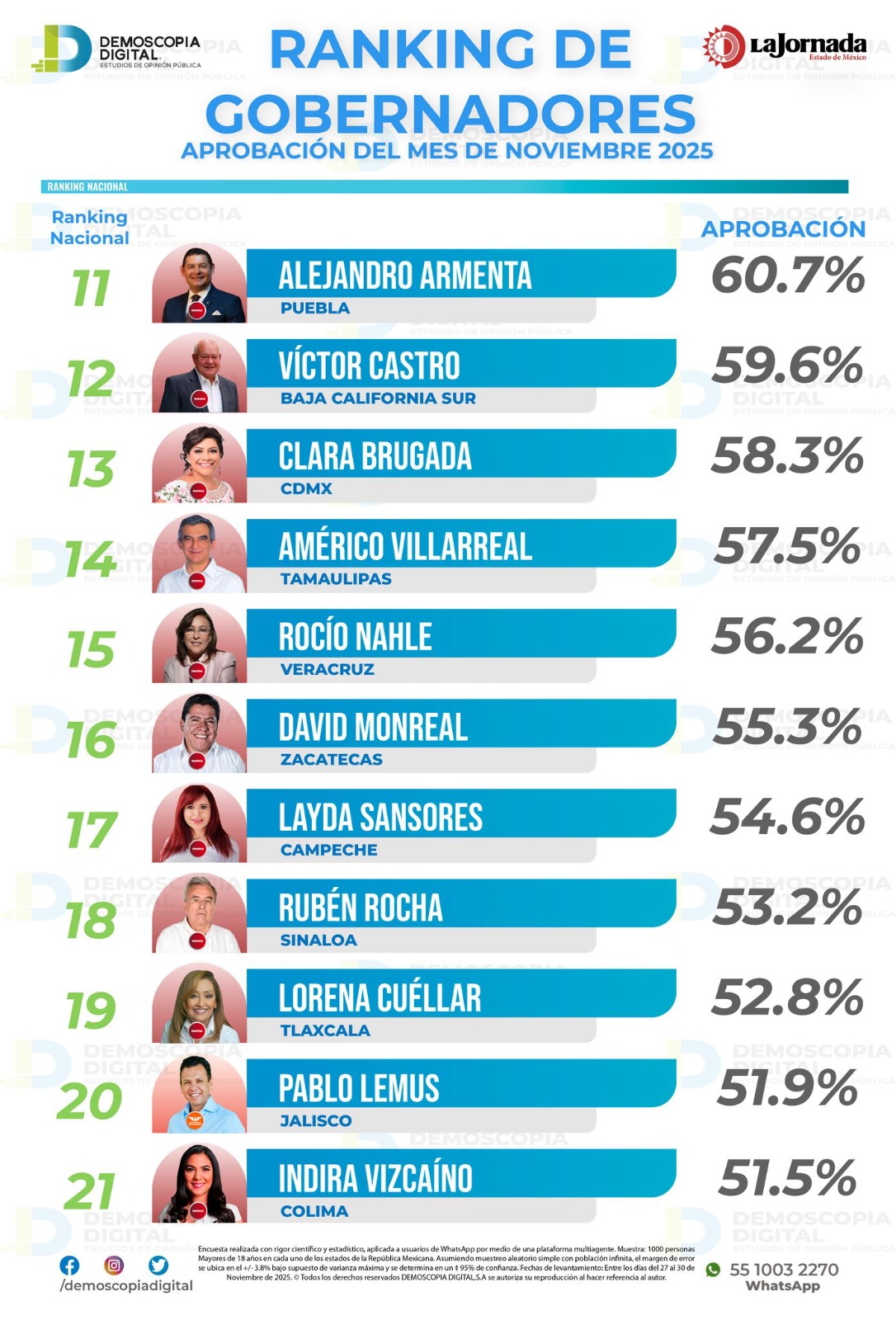 Sin embargo, para Demoscopia Digital en su medición, Víctor en noviembre se colocaba en el lugar número 12 en cuanto aprobación de su gobierno con un 59.6%, es decir 10 puntos de diferencia con la de Mitofsky.