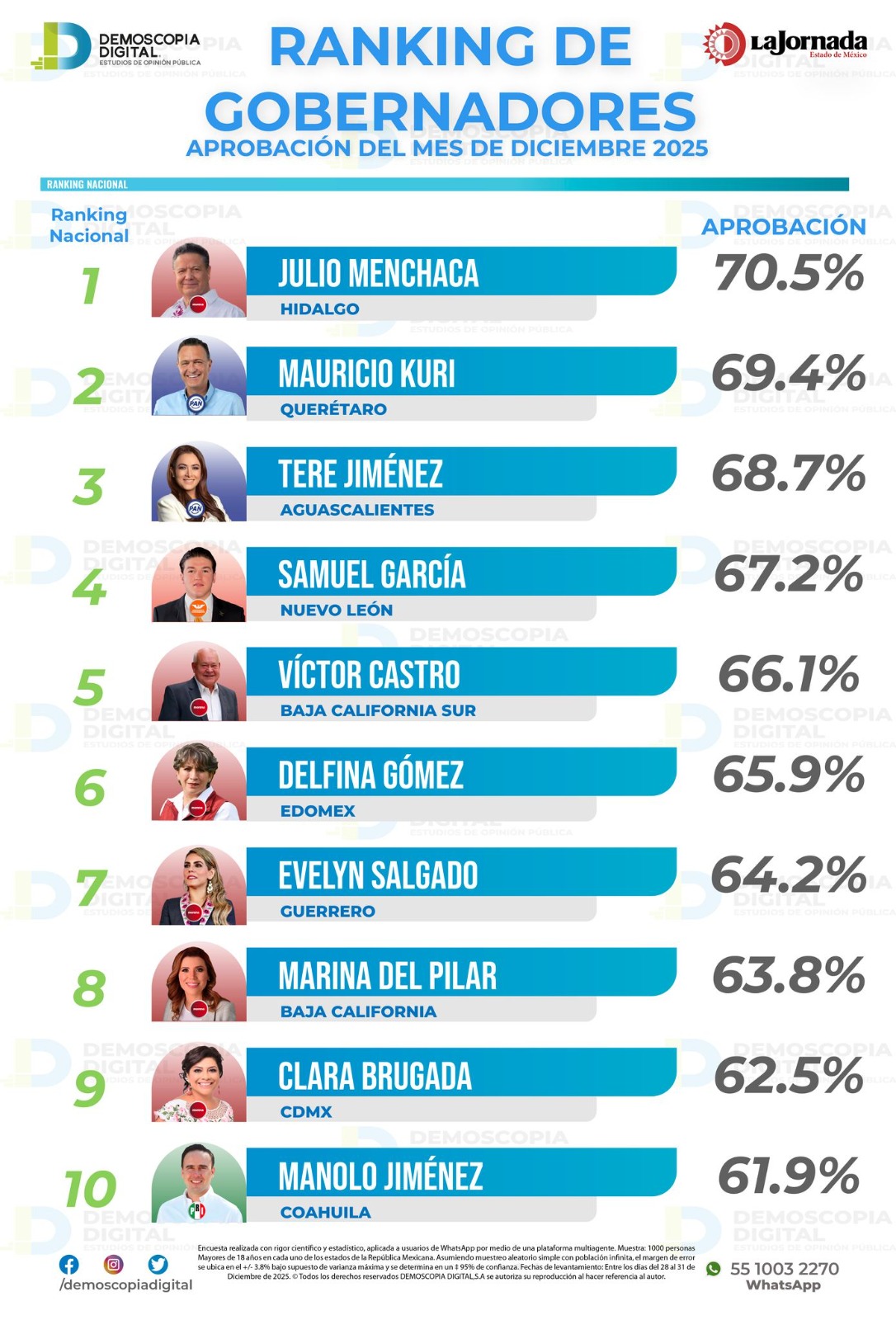 Las empresas Mitofsky y Demoscopia Digital realizan un ranking de los gobernadores mejor y peor evaluados del país.