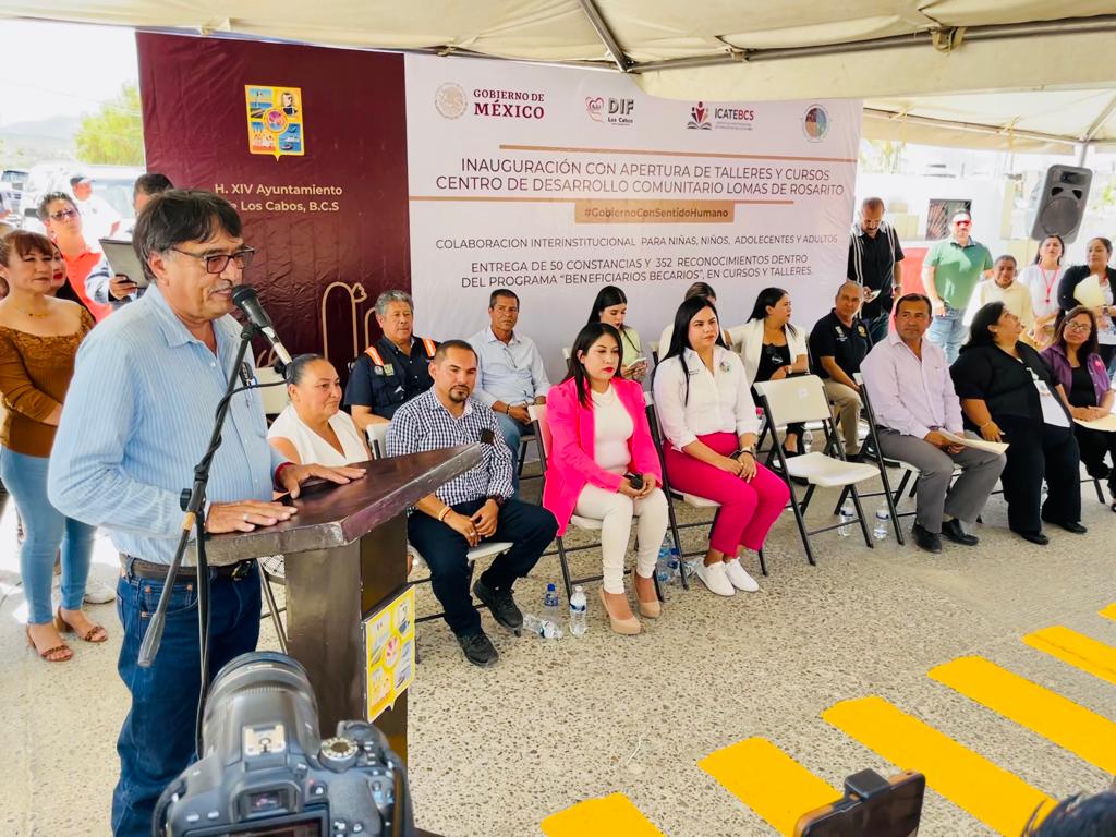 Ayuntamiento de Los Cabos, el alcalde Oscar Leggs Castro, acompañado del cuerpo edilicio del Honorable Cabildo, así como parte del gabinete que incluye a las y los representantes de las áreas involucradas en la rehabilitación, mantenimiento y personal calificado para impartir talleres y cursos a través de ICATEBCS y CECATI #104, tuvo a bien reinaugurar el Centro de Desarrollo Comunitario de Lomas de Rosarito y hacer entrega de 50 constancias y 352 reconocimientos del programa “Beneficiarios becarios en cursos y talleres” a niñas, niños, adolescentes y personas adultas.