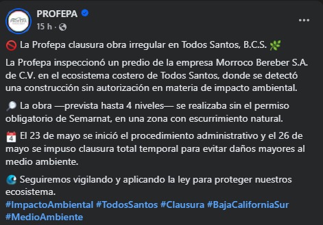 “La Profepa inspeccionó un predio de la empresa Morroco Bereber S.A. de C.V. en el ecosistema costero de Todos Santos, donde se detectó una construcción sin autorización en materia de impacto ambiental”.