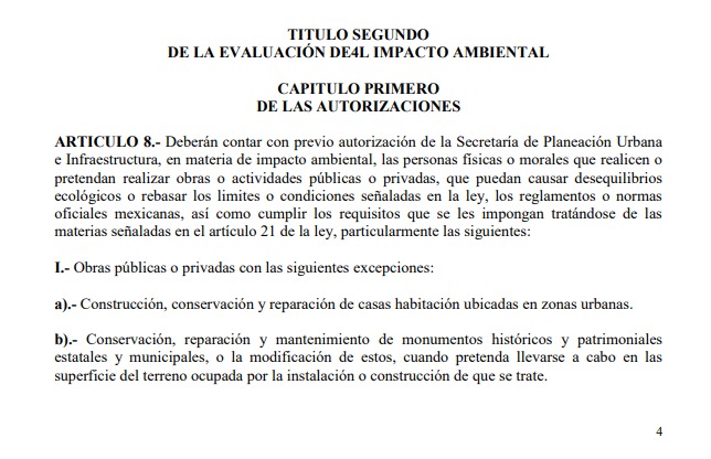 “Deberán contar con previa autorización de la Secretaría de Planeación Urbana e Infraestructura, en materia de impacto ambiental, las personas físicas o morales que realicen o pretendan realizar obras o actividades públicas o privadas, que puedan causar desequilibrios ecológicos”.
