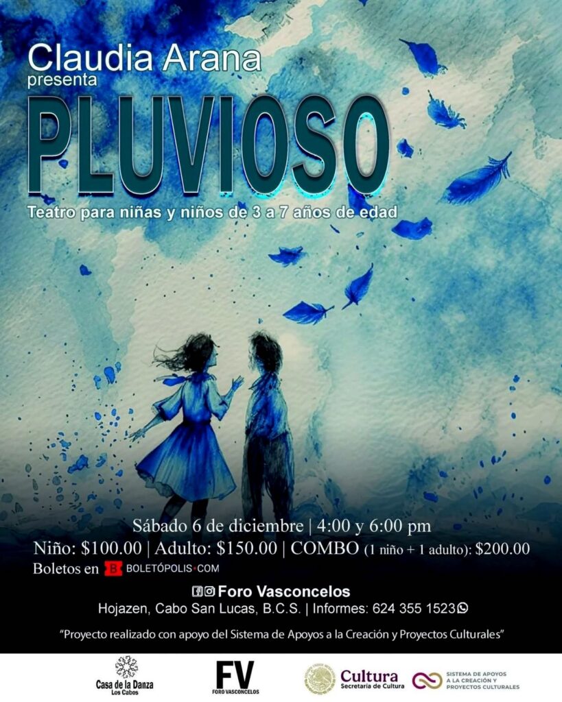 Este sábado 06 de diciembre, el Foro Vasconcelos de Cabo San Lucas recibirá la obra “Pluvioso”, dirigida por la artista escénica Claudia Arana y diseñada especialmente para niñas y niños de 3 a 7 años.