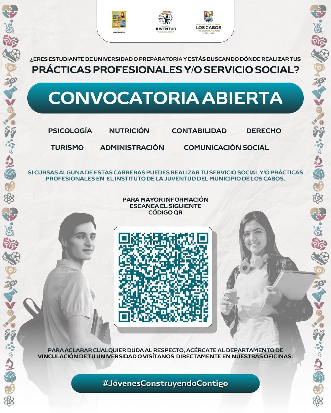 Los Cabos.-El Instituto de la Juventud del Municipio de Los Cabos (INJUVE) lanzó una convocatoria dirigida a estudiantes de bachillerato y nivel superior interesados en realizar su servicio social o prácticas profesionales dentro de áreas de la administración pública municipal.