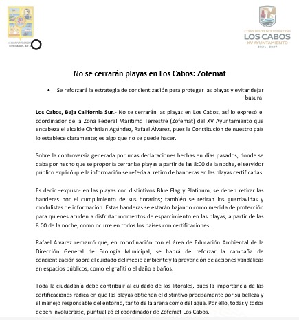 “Lo que el coordinador de Zofemat quiso decir” (dice sin decirlo el boletín), es que a partir de las 8:00 de la noche se bajarán las banderas Blue Flag de las playas (lo cual si lo hacen es un acto simbólico que no significa el cierre de playas).