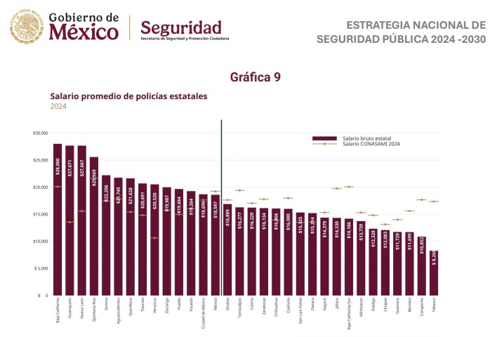 En el mismo documento de la Estrategia Nacional De Seguridad Pública 2024-2030, se publica una gráfica con los salarios mensuales promedio de lo policías de cada una de las 32 entidades federativas.