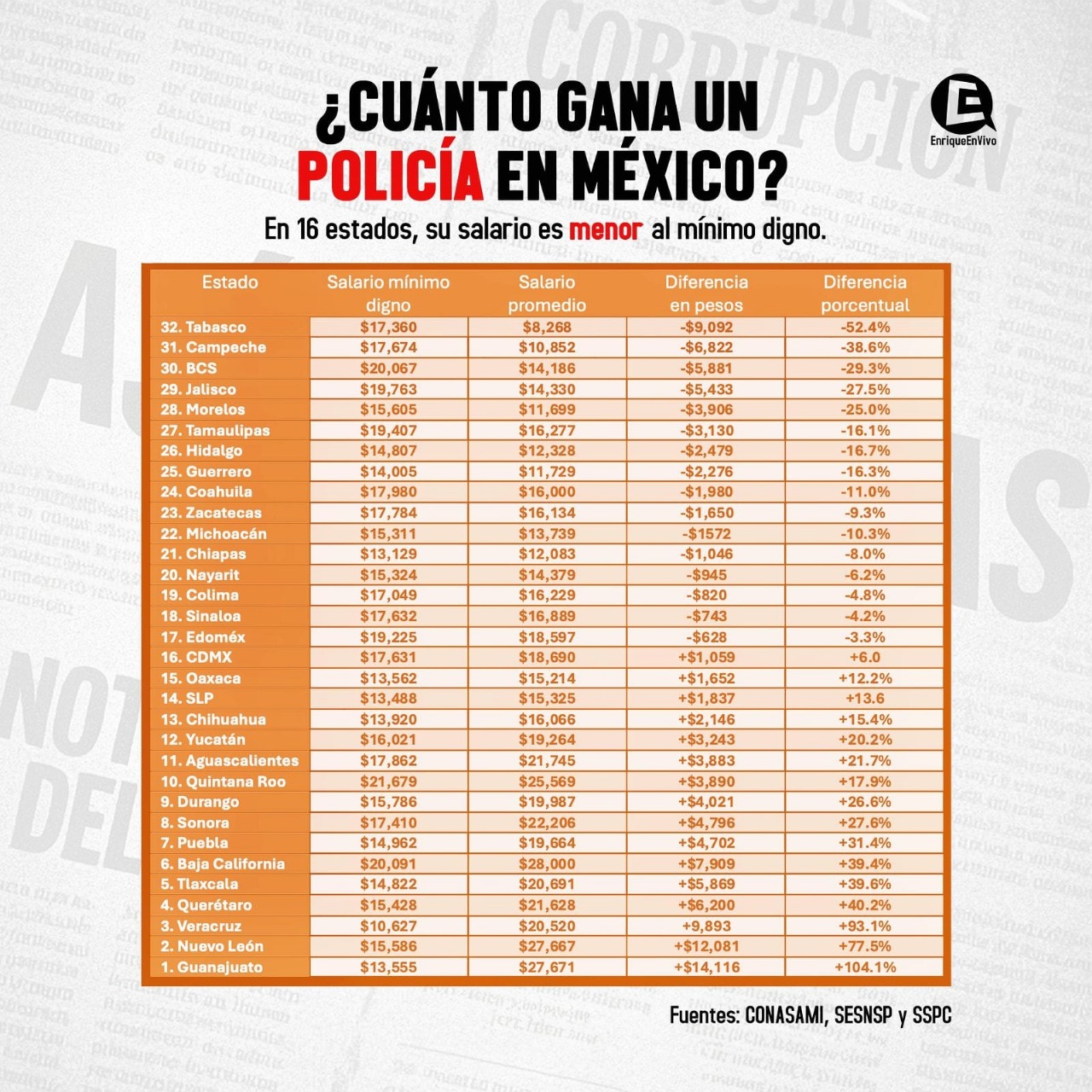 Pero un ejercicio más ilustrativo lo hizo el equipo del programa “Así las Cosas” de W Radio, donde tomaron los datos sobre los salarios de los policías de la ENS de Harfuch y las contrastaron con el salario digno estimado para cada uno de los estados señalado por la Comisión Nacional de Salarios Mínimos.