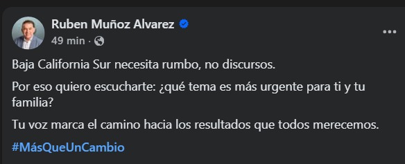 “Baja California Sur necesita rumbo, no discursos. Por eso quiero escucharte: ¿qué tema es más urgente para ti y tu familia? Tu voz marca el camino hacia los resultados que todos merecemos. #MásQueUnCambio”.