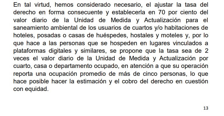 – A los usuarios de hospedaje a través de plataformas digitales como Airbnb, se les impone una tasa del doble del valor diario de la Unidad de Medida y Actualización por cada casa o departamento ocupado.