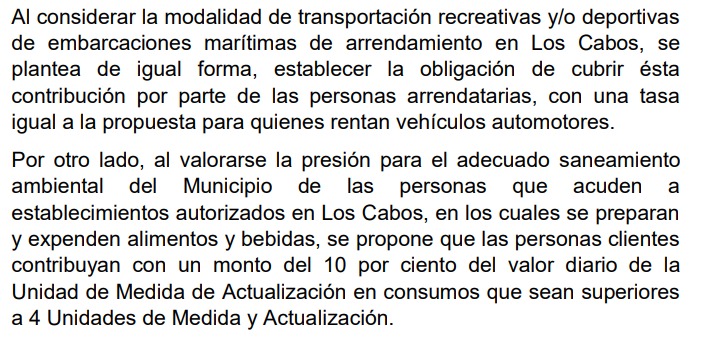 En próximos días ante el pleno del Congreso del Estado se presentará una agresiva reforma fiscal a través de la Ley de Hacienda del Municipio de Los Cabos, que además de incrementar el pago de Derecho al Saneamiento Ambiental que hoy pagan huéspedes de hotel y de plataformas digitales, agrega como sujetos obligados a los clientes de bares y restaurantes, rentas de carros y embarcaciones deportivas y recreativas; así como el incremento de un 1% al Impuesto Sobre Adquisición de Bienes Inmuebles.