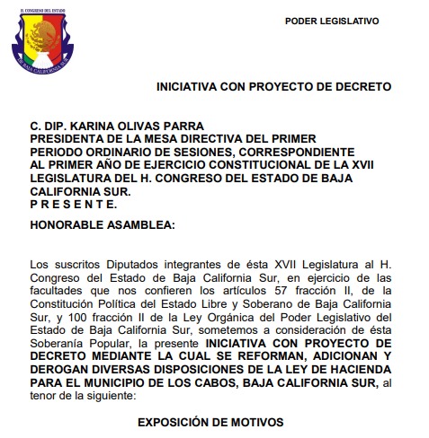 Hoy dicha propuesta se ve materializada en una e INICIATIVA CON PROYECTO DE DECRETO MEDIANTE LA CUAL SE REFORMAN, ADICIONAN Y DEROGAN DIVERSAS DISPOSICIONES DE LA LEY DE HACIENDA PARA EL MUNICIPIO DE LOS CABOS, BAJA CALIFORNIA SUR que presentan ante el pleno los diputados señalados y cuyo texto obra en poder de HOY BCS y se puede descargar en el siguiente link para su consulta y análisis: