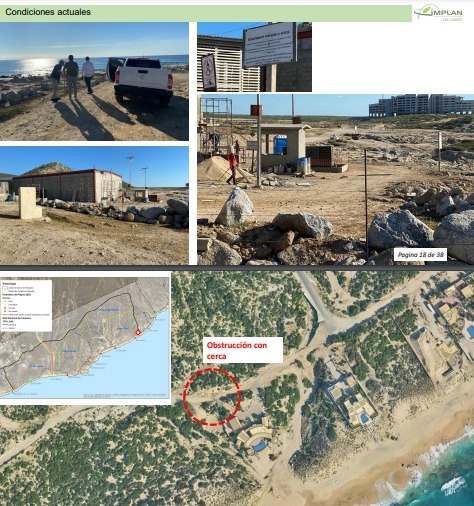 3.- Señaló que la “adecuación” de los 3.9 km (que se pretenden en desuso) contempla 9 accesos a playa y en 5 de esos la construcción de parques de playa accesibles a todo público por parte los desarrolladores, desde la carretera (la de ellos, la pavimentada) hasta la playa, con estacionamientos baños y regaderas.