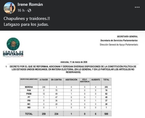 Por su parte, la presidenta del DIF estatal y principal operadora en Morena del grupo político del gobernador Víctor Castro Cosío, Patricia López Navarro, difundió en redes sociales el resultado de la votación legislativa bajo el mensaje: “Se consuma traición al pueblo de México”.