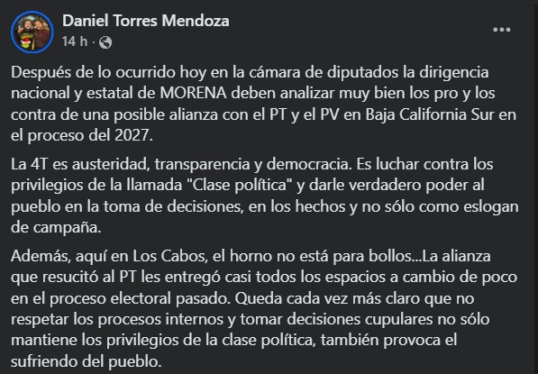 Uno de ellos fue el fundador de Morena en Los Cabos, Daniel Torres, quien planteó que la dirigencia del partido debería revisar la conveniencia de mantener alianzas con el PT y el PVEM en Baja California Sur rumbo al proceso electoral de 2027.