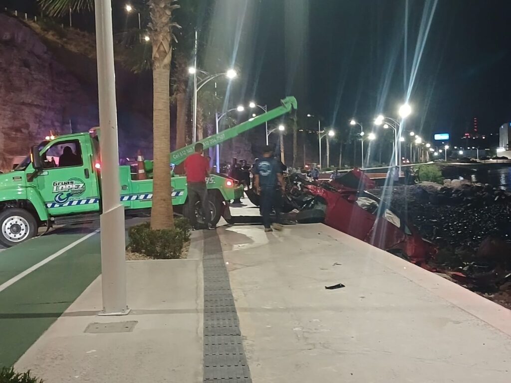De acuerdo con el parte policial, el accidente ocurrió alrededor de las 21:50 horas, cuando un automóvil tipo sedán color rojo perdió el control, derribó dos palmas y terminó a la orilla del mar, generando alarma entre los testigos que se encontraban en el andador costero.