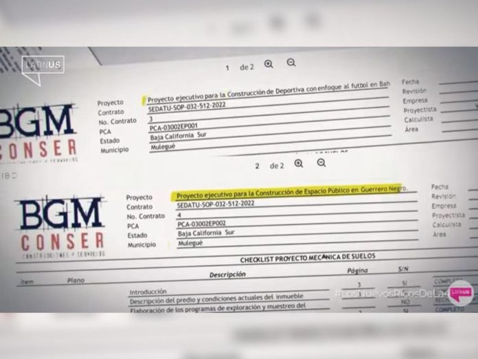 En un frame del video, se exhiben fragmentos del contrato SEDATU-SOP-032-512-2022 para las obras: “Proyecto ejecutivo para deportiva con enfoque al futbol en Bahía Tortugas” y “Proyecto ejecutivo para construcción de espacio público en Guerrero Negro”, ambas en el municipio de Mulegé en Baja California Sur.