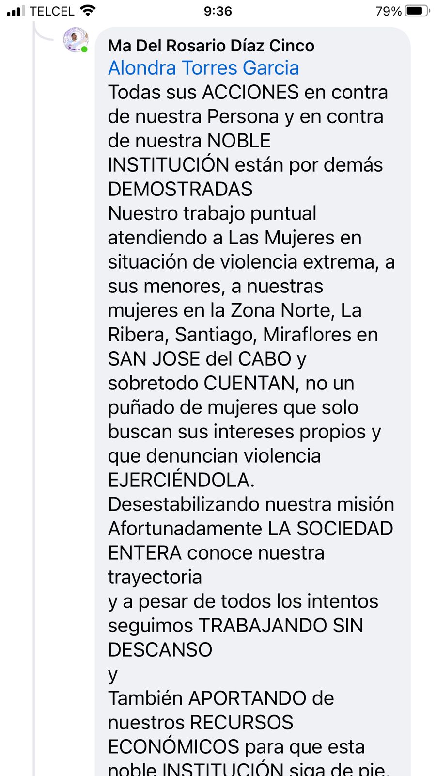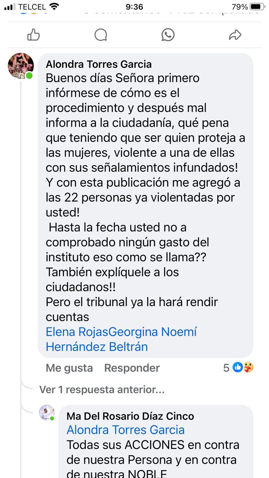 En la misma publicación, Alondras Torres García respondió a sus comentarios y le echó en cara no haber comprobado ningún gasto del Instituto de las Mujeres.