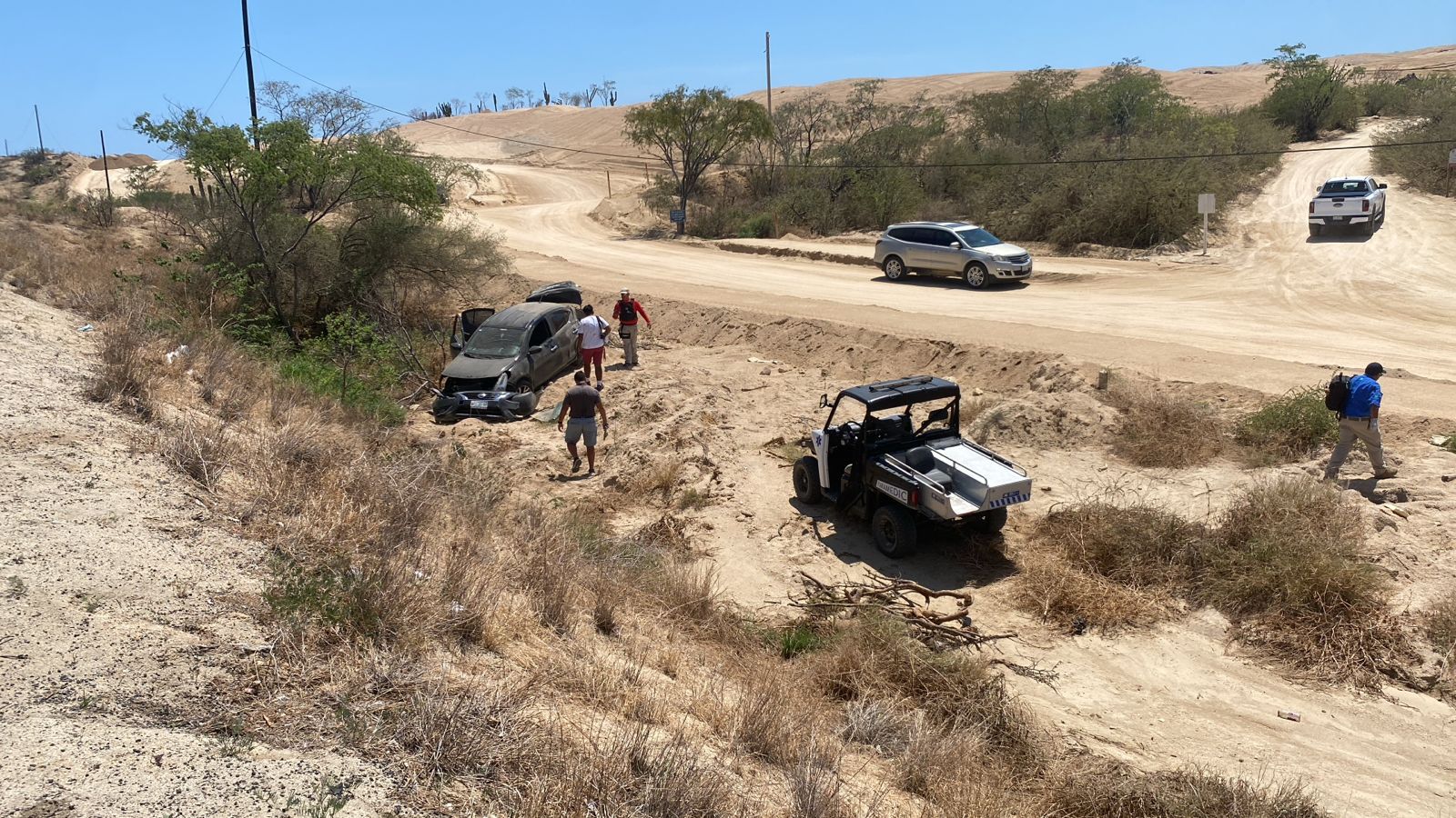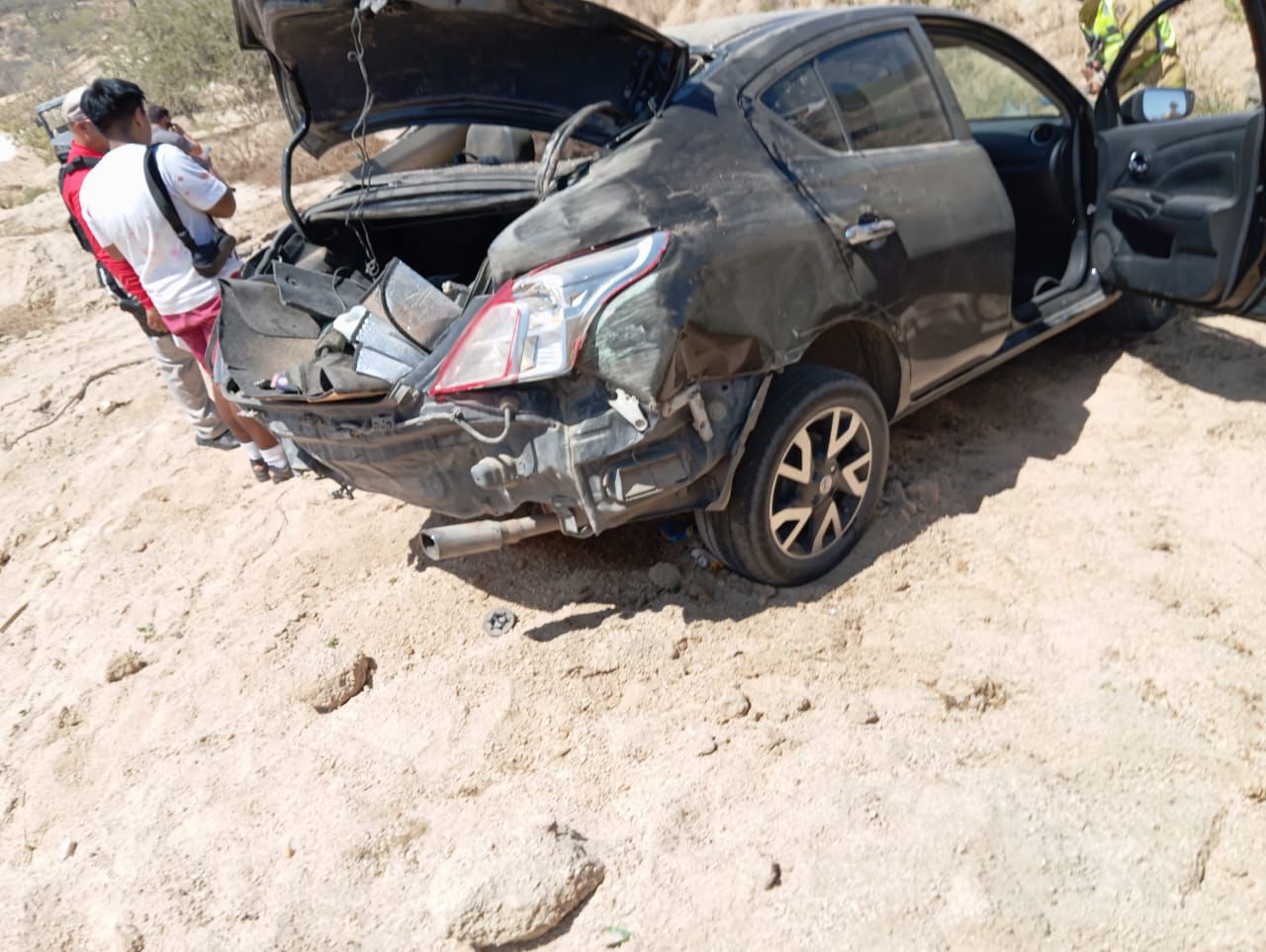 Un vehículo tipo sedan color negro que transitaba por el corredor turístico de Los Cabos perdió el control y terminó volcado a varios metros de la carretera Transpeninsular.