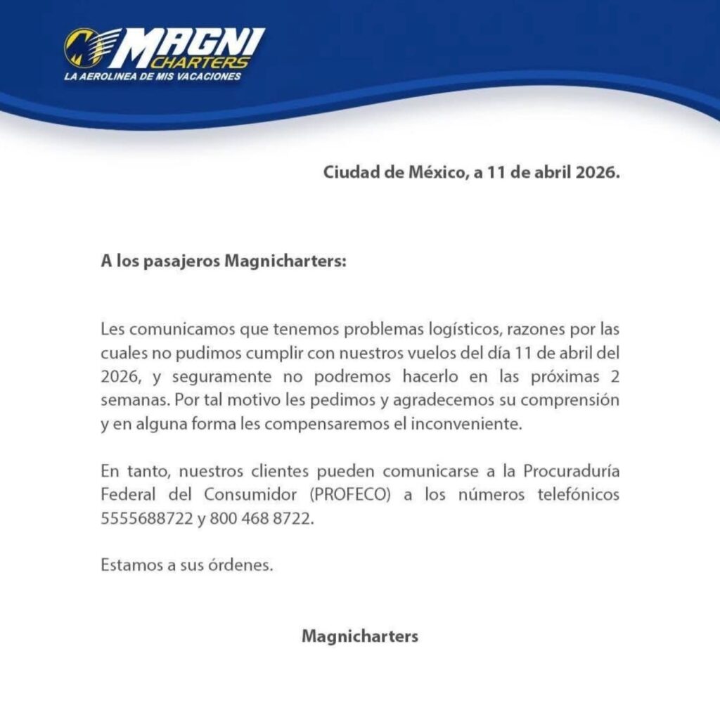 Ciudad de México.– La aerolínea mexicana Magnicharters anunció la cancelación total de sus vuelos durante las próximas dos semanas, debido a problemas logísticos, lo que ha generado afectaciones a pasajeros en distintos aeropuertos del país.