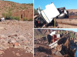 Santa Rosalía, BCS.- La tarde del sábado 6 de septiembre, en plena contingencia por las lluvias del huracán Lorena, un tráiler fue arrastrado por la fuerza del arroyo El San Luciano, a...
