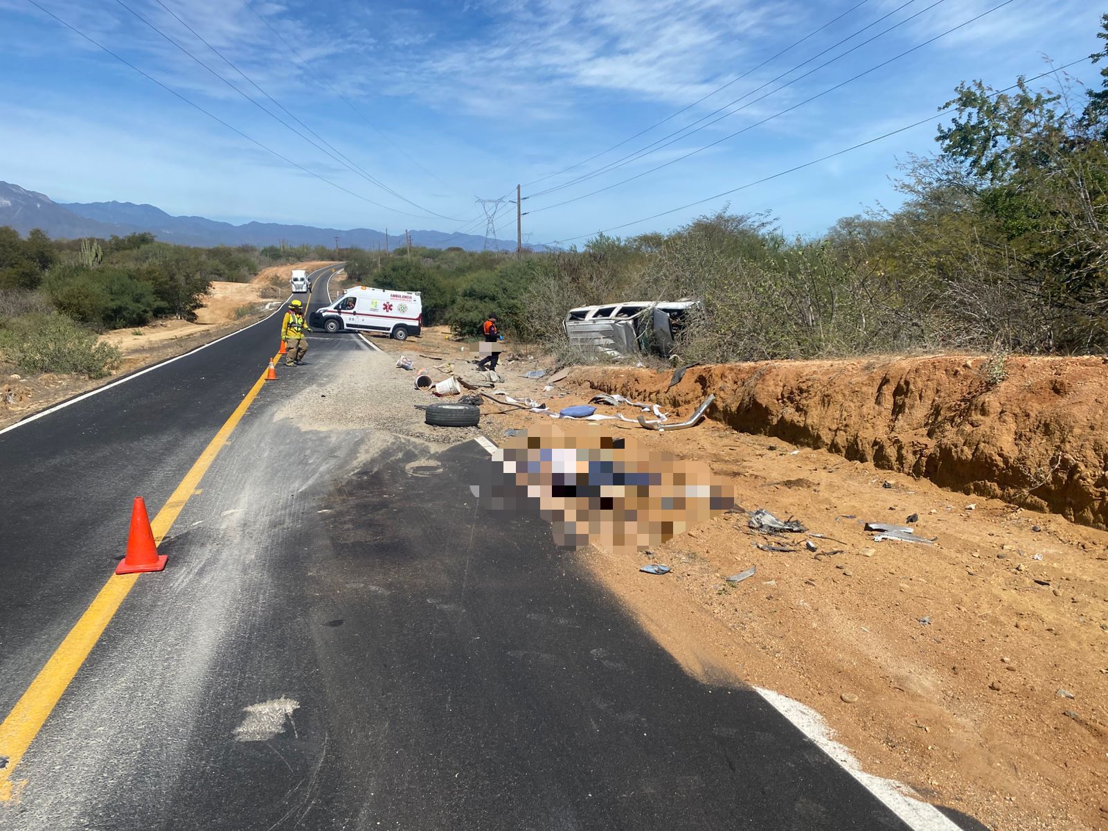 Al arribar las unidades A-615 y R-01, los cuerpos de emergencia localizaron una camioneta volcada entre la maleza, a varios metros de la carretera, así como múltiples restos del vehículo y pertenencias esparcidas a lo largo del acotamiento, lo que evidencia la fuerza del impacto.