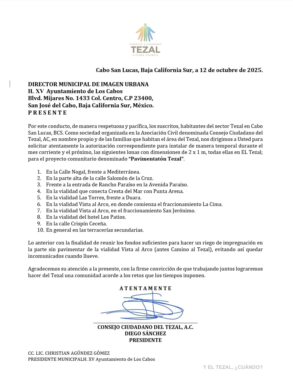 Cabo San Lucas, B.C.S.– A través de un oficio dirigido al XV Ayuntamiento de Los Cabos, habitantes del sector El Tezal, agrupados en el Consejo Ciudadano del Tezal, A.C., solicitaron formalmente la autorización para instalar lonas informativas en distintos puntos de la zona, como parte del proyecto comunitario “Pavimentando Tezal”, con el objetivo de recaudar recursos y mejorar las vialidades del área.