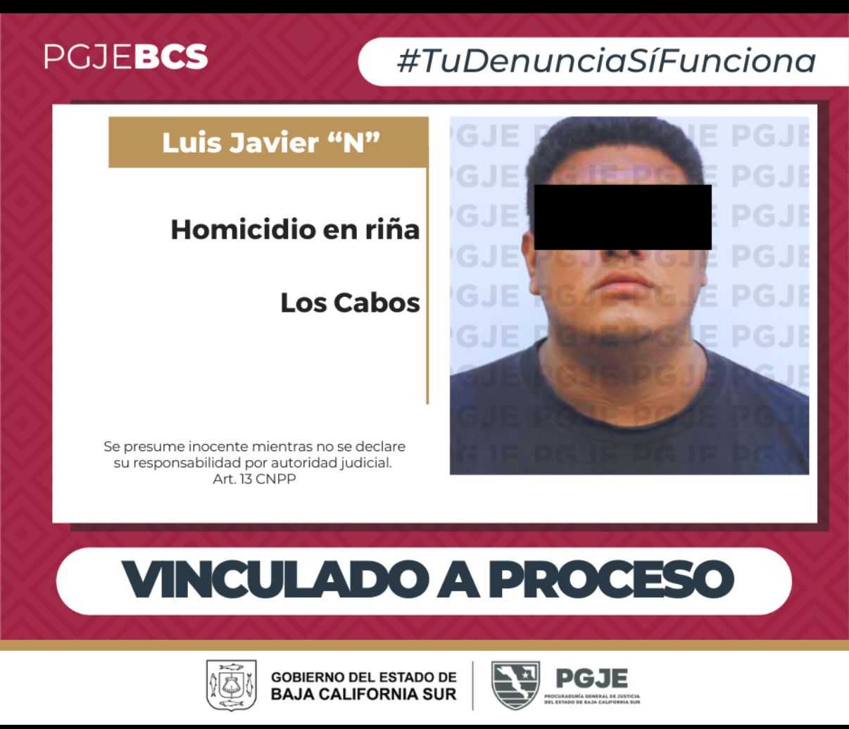 Cabo San Lucas, B.C.S.– La Procuraduría General de Justicia del Estado (PGJE) informó que un juez de control vinculó a proceso a Luis Javier “N”, imputado por el delito de homicidio en agravio de un hombre, ocurrido el pasado 28 de septiembre en la colonia Tierra y Libertad de esta ciudad.